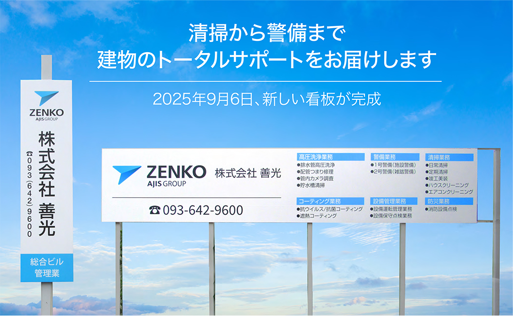 このたび、2025年5月1日より新社名「株式会社 善光(ぜんこう)」としてスタートすることとなりました。これを機に、従来のビルメンテナンス業務に加え、新たに2号警備業務(交通誘導・雑踏警備)の分野にも取り組み、より一層地域社会に貢献してまいります。今後とも変わらぬご支援を賜りますようお願い申し上げます。